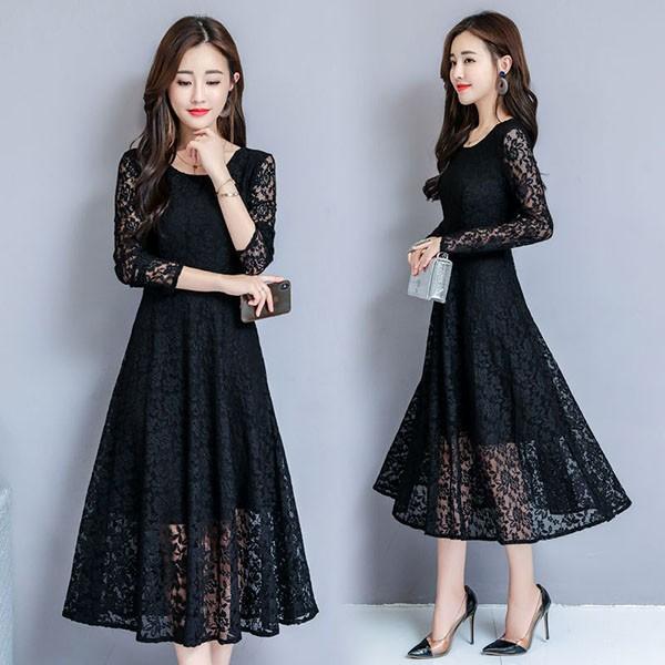 結婚式 ワンピース ロング 袖あり レース 黒 大きいサイズ 20代 30代