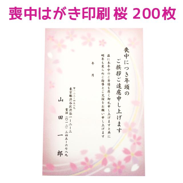 喪中はがき 桜デザイン 200枚 印刷 さくら 寒中見舞い 年賀欠礼 ハガキ
