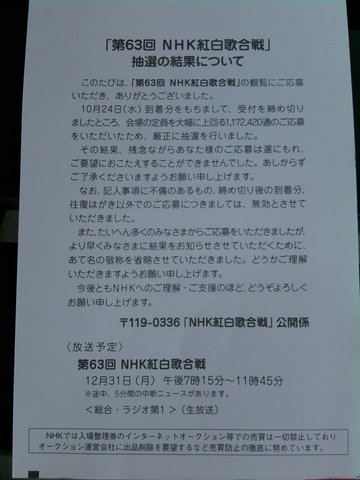 狩野自動車工業 狩野雄司のブログ nhk紅白歌合戦 観覧希望抽選会